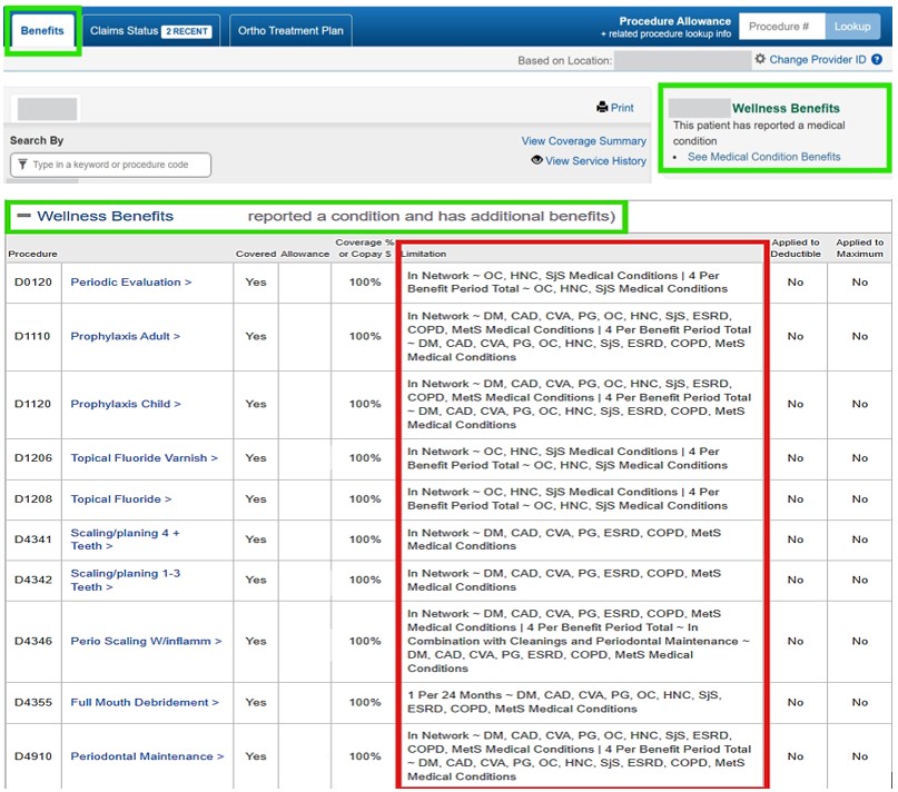 3) If a patient is enrolled, the Wellness Benefits box on the right-hand side will indicate, “This patient has reported a condition.” Then, the section will expand to display which benefits are covered and for which conditions (see example below).